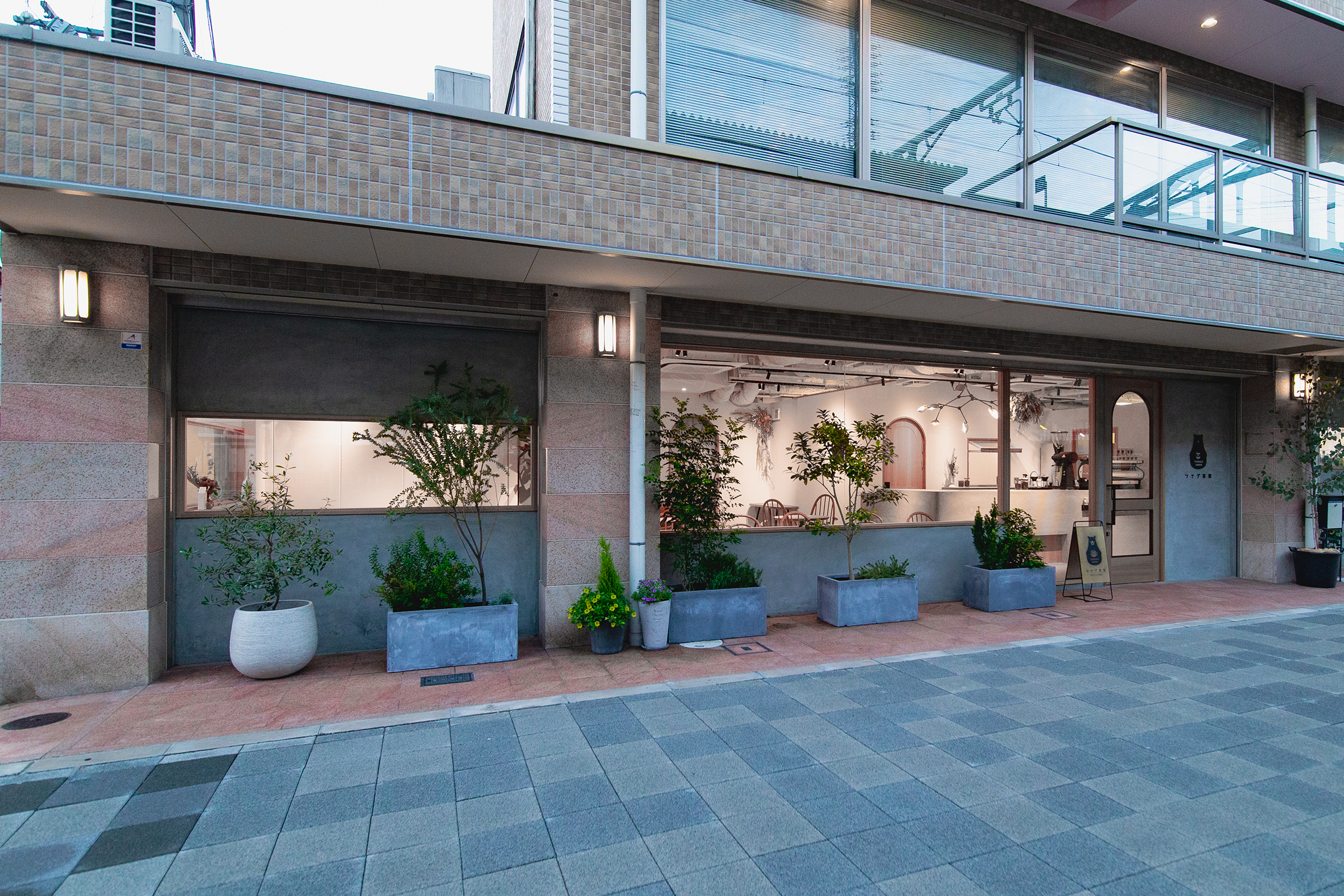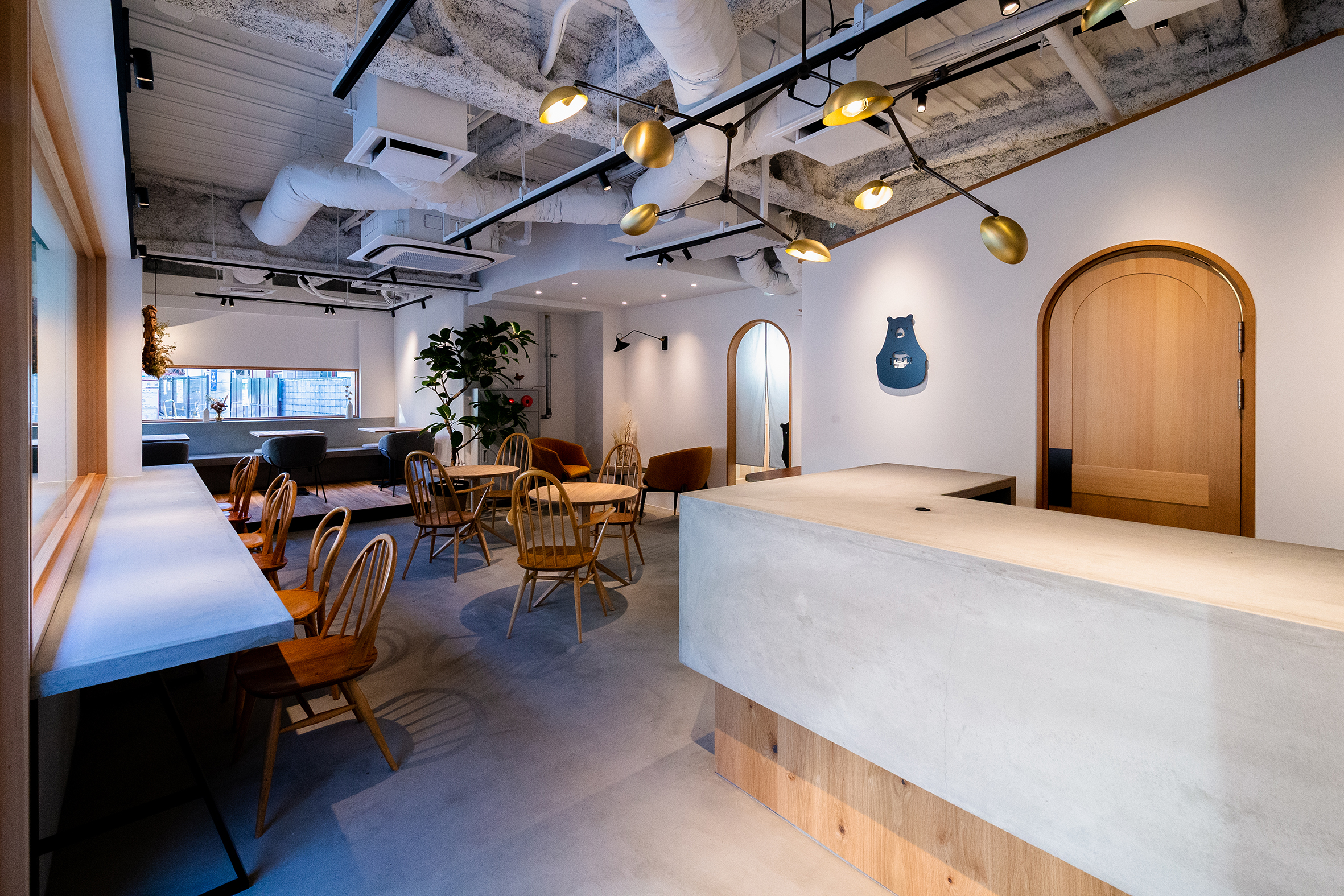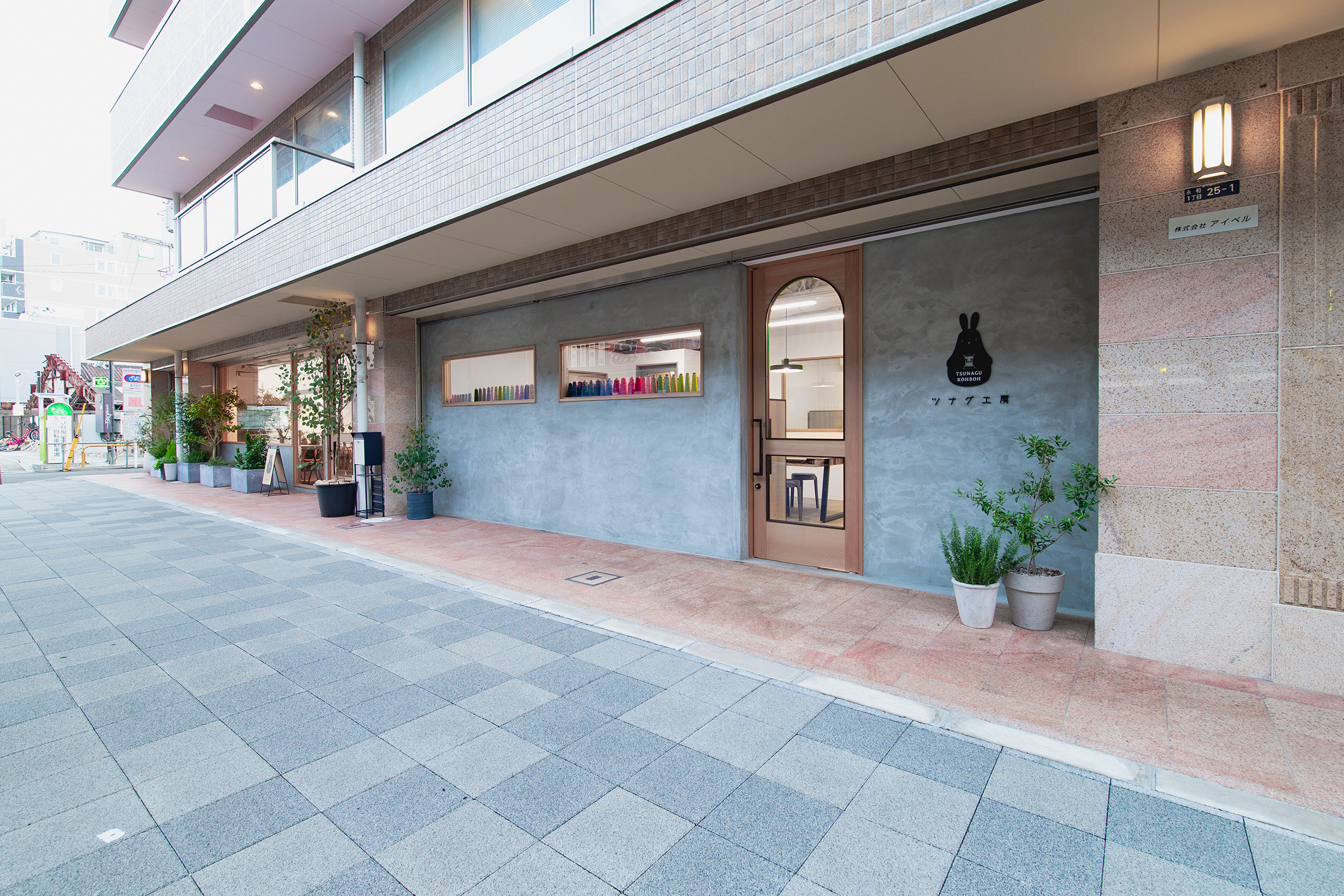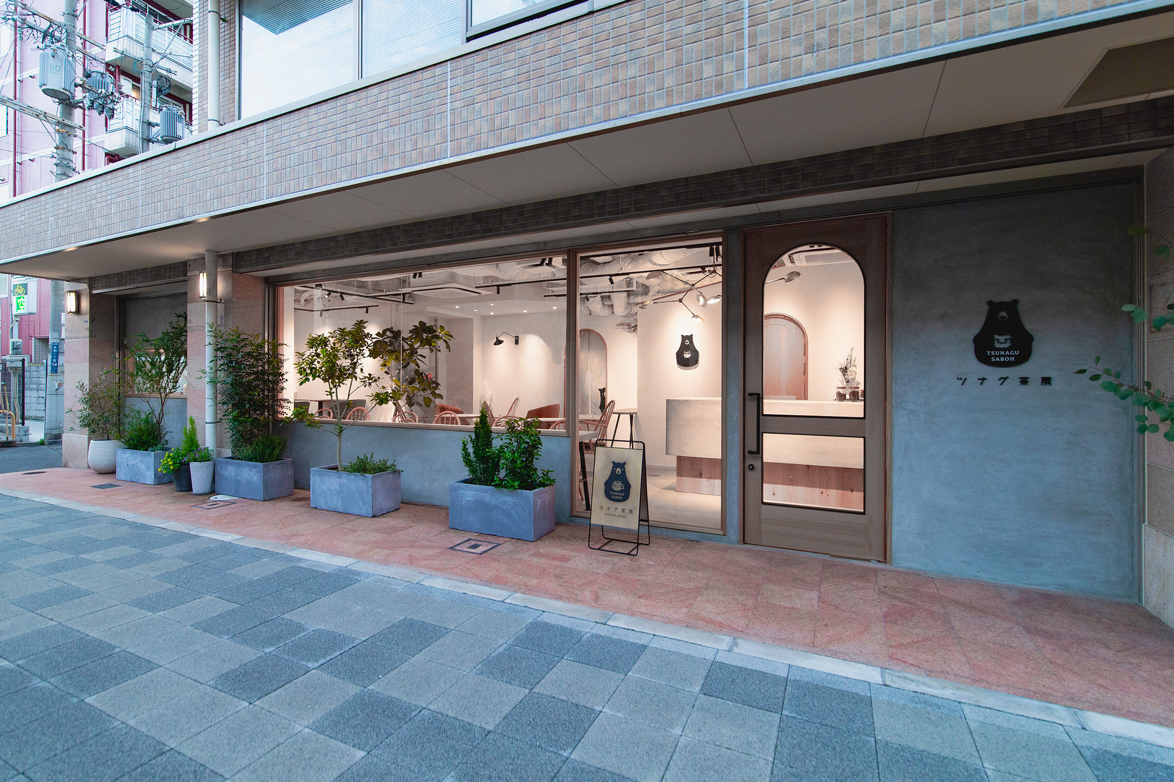 大阪・東大阪市にオープンした就労支援を事業展開する株式会社TUNAGUが運営するカフェと作業場のデザイン。様々な事情を抱えた方たちが同じ目線で集える場所として家をモチーフに、モルタルと木、鉄を使用し、スタイリッシュでありながら温かみを感じる空間を目指した。それは福祉業界のイメージを払拭するための施策でもある。黒いクマのキャラクター「サボウくん」が人気を博し、ツナグ茶房は連日多くの人で賑わっている。