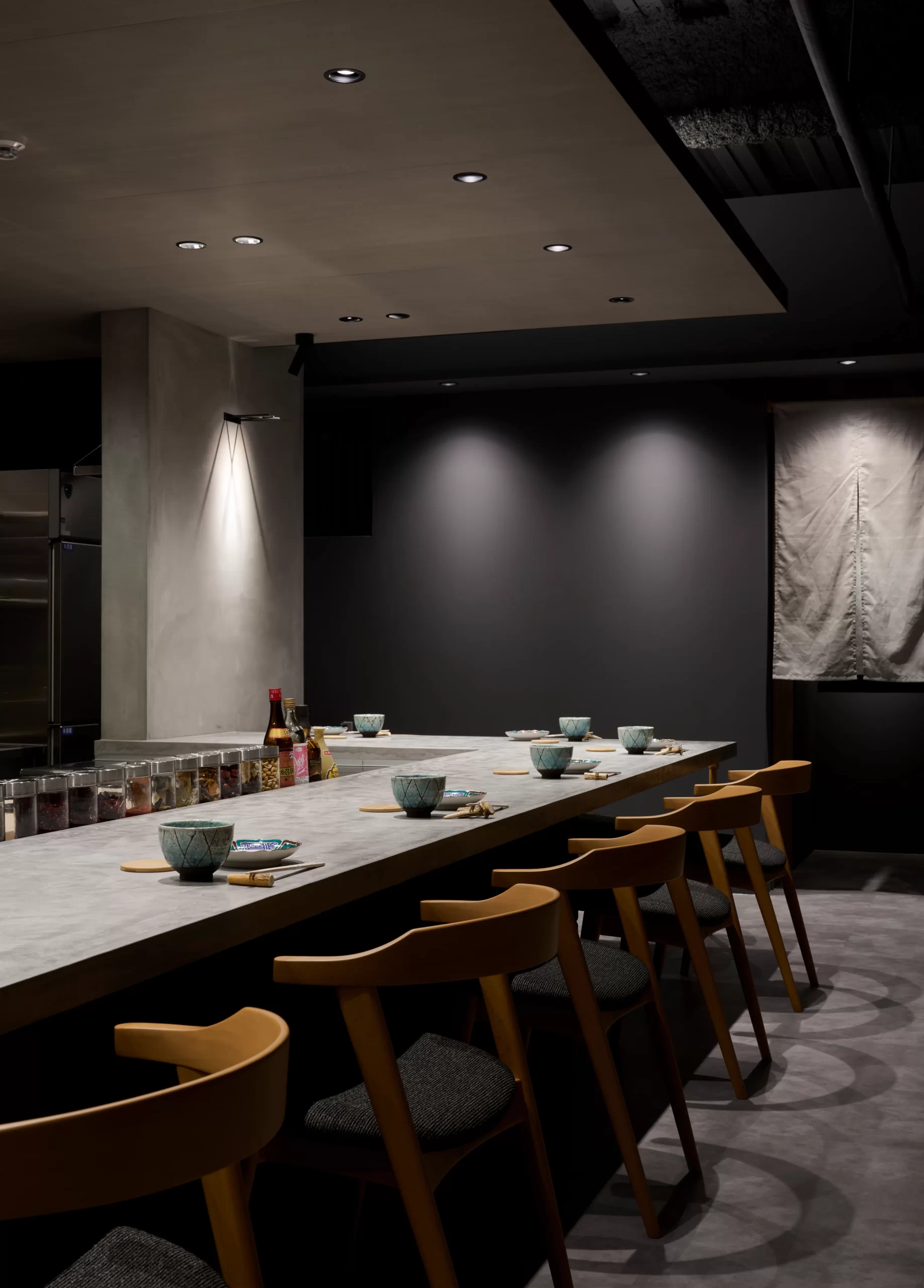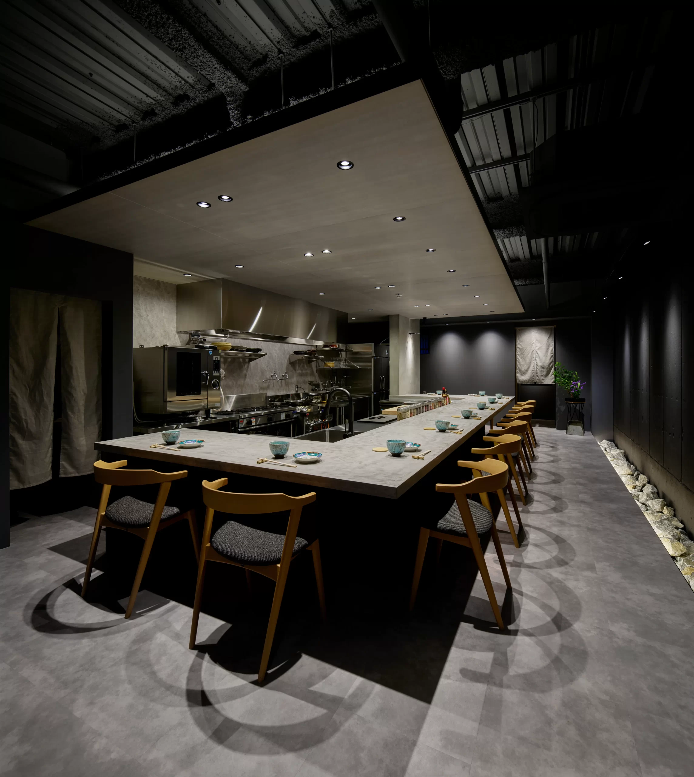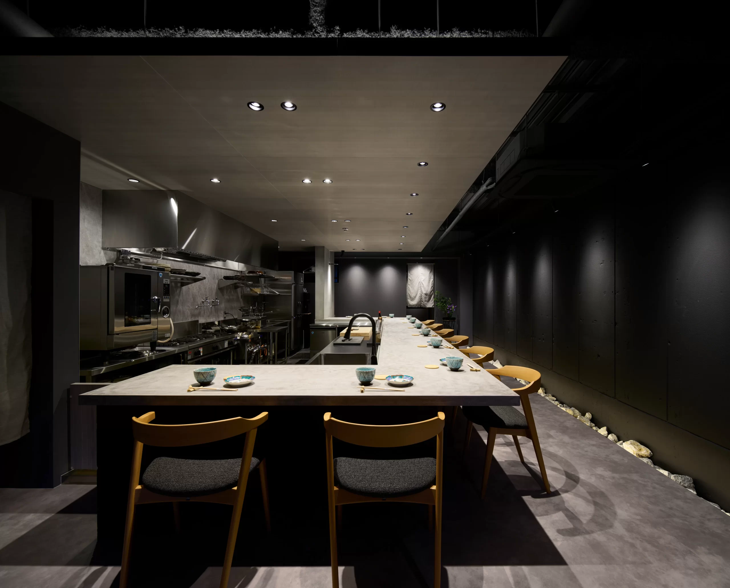 和食、フレンチ、中華といった様々な料理の研鑽を積まれたシェフが奈良で独立開業した中国料理レストラン。ランチタイムは2~3組、ディナータイムは1組限定で、厳選した奈良の食材を活かしたヌーベルシノワを提供する特別な時間を過ごすための空間。お客様とのコミュニケーションを大事にしたいという想いから対面カウンタースタイルのオープンキッチンとした。キッチンをステージと見立て、シェフの動きを眺めながら料理を楽しむライブ感を意識した。グレイを基調とした素材を多用し色彩を持たない空間となっているが、シェフが織りなす料理とそれを食すお客様の心が彩りを与えることで完成する空間である。